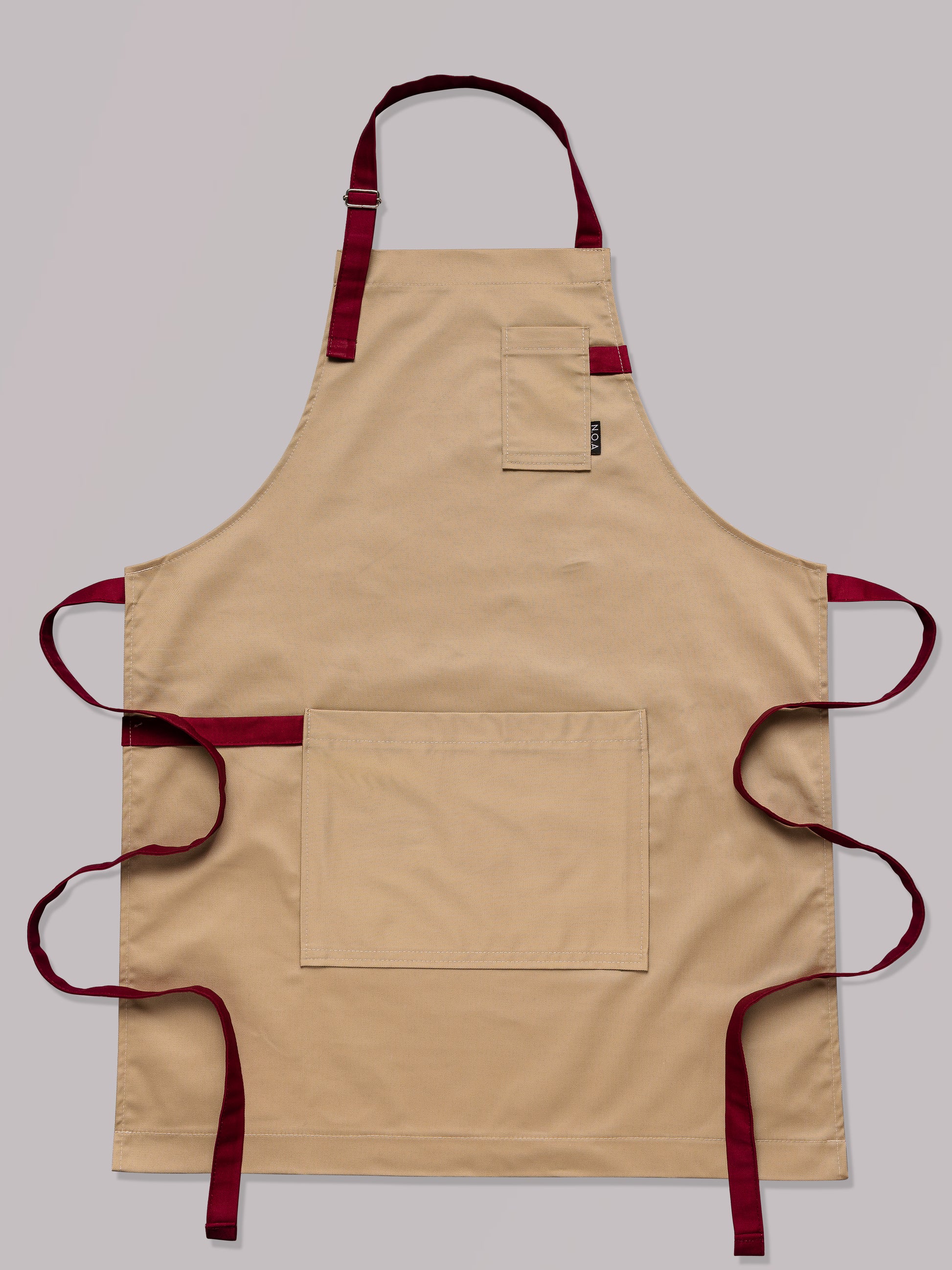 Șorț bej chef NOA – ediție profesională cu bretele burgundy