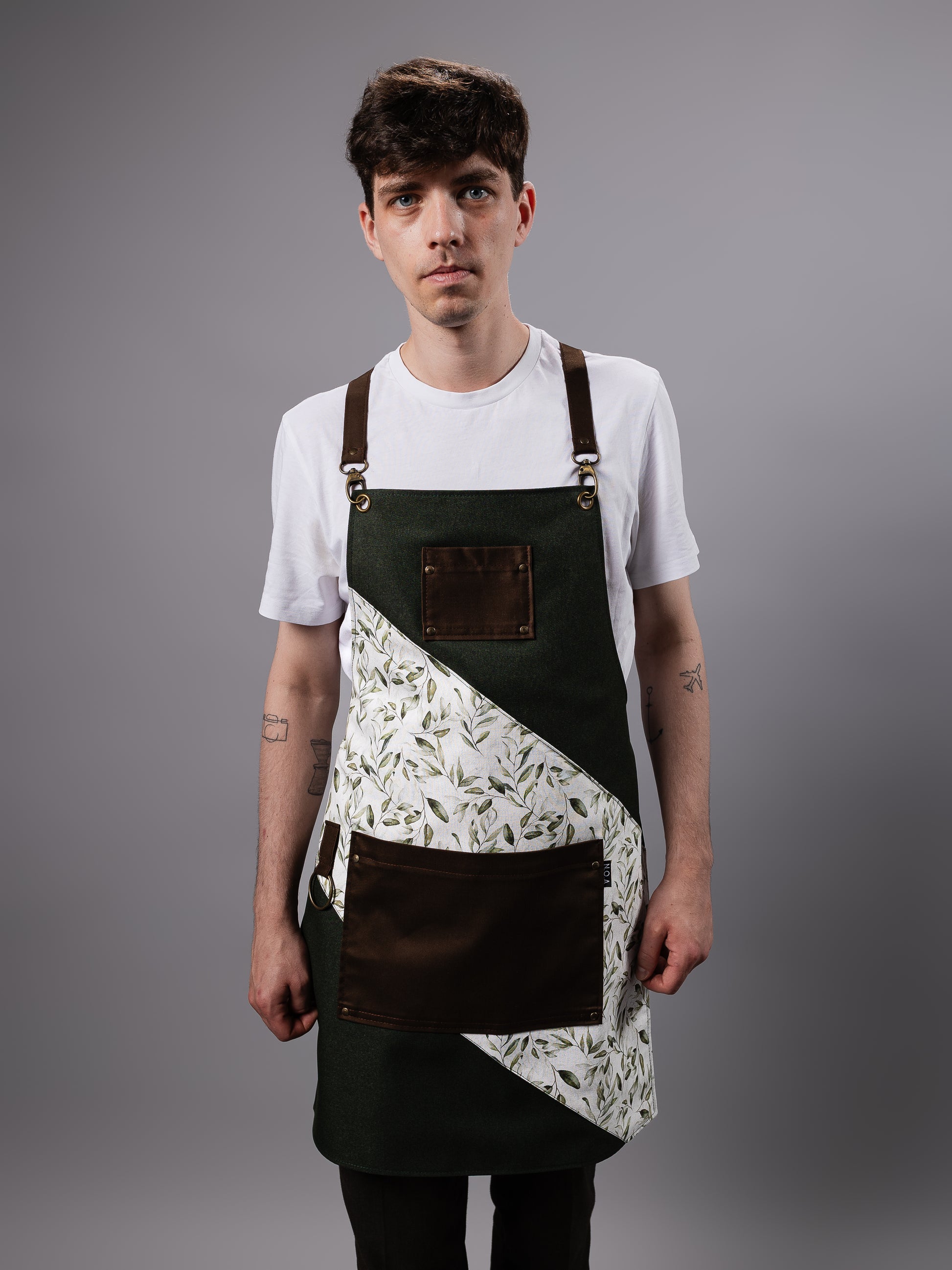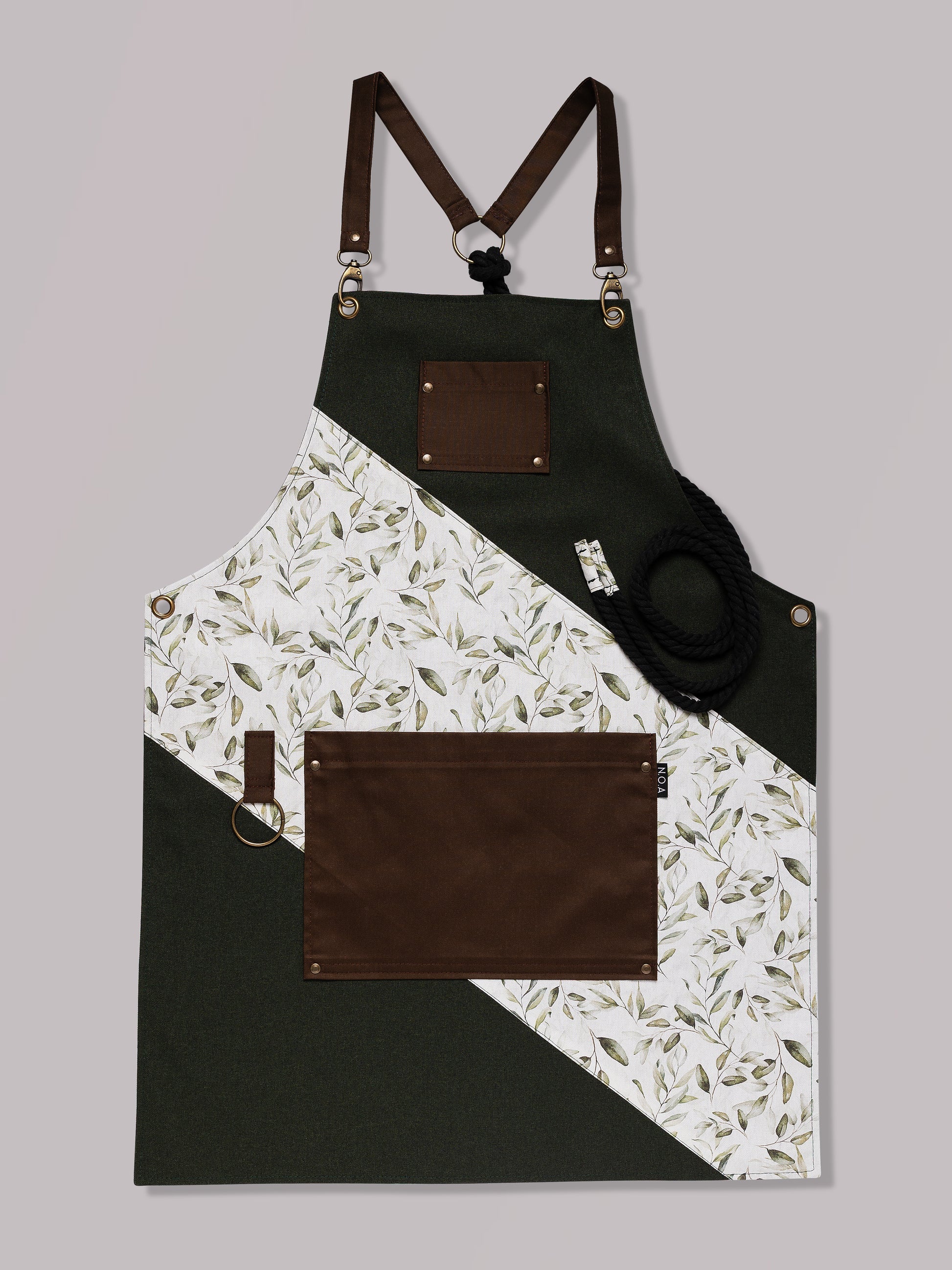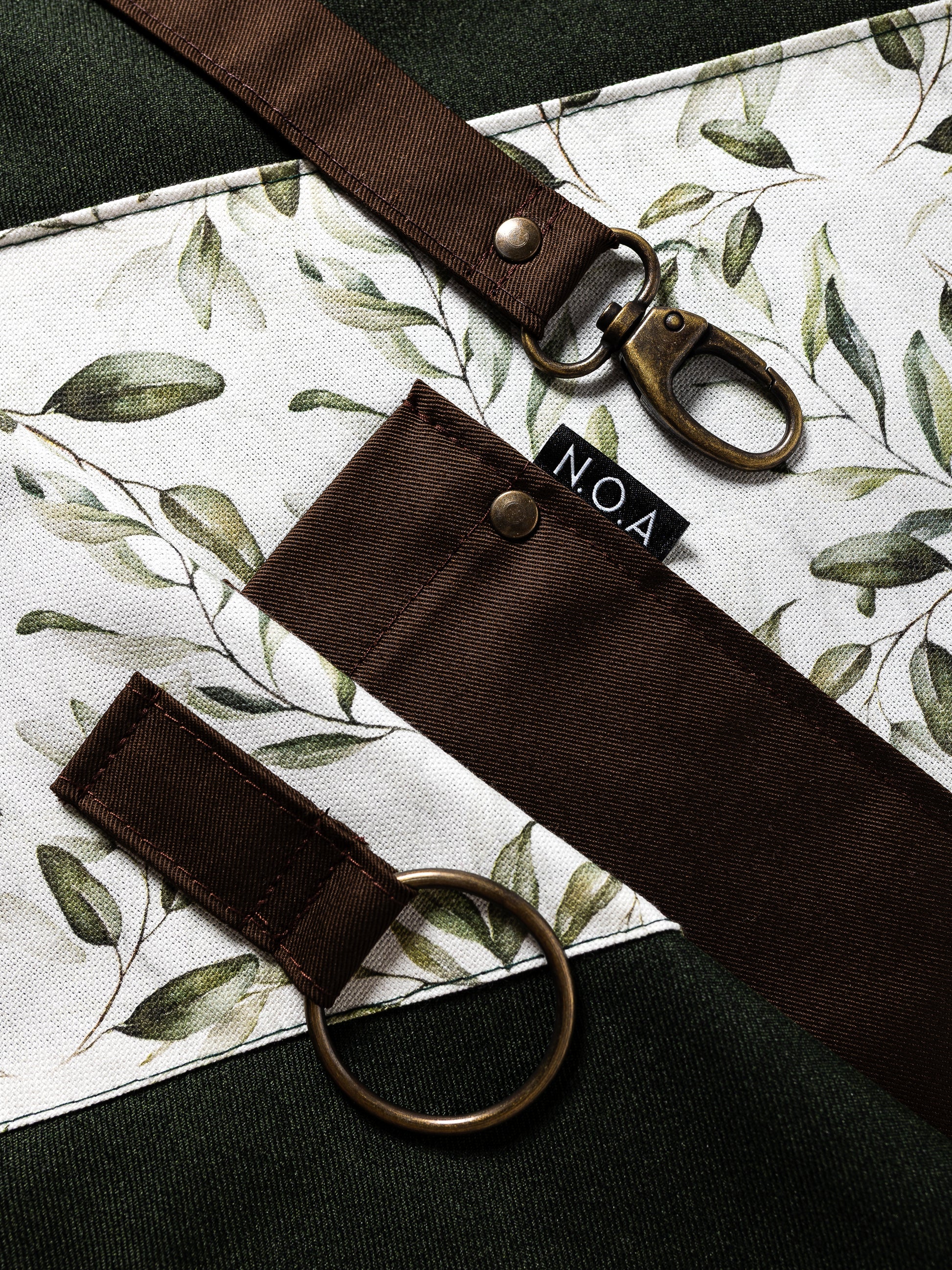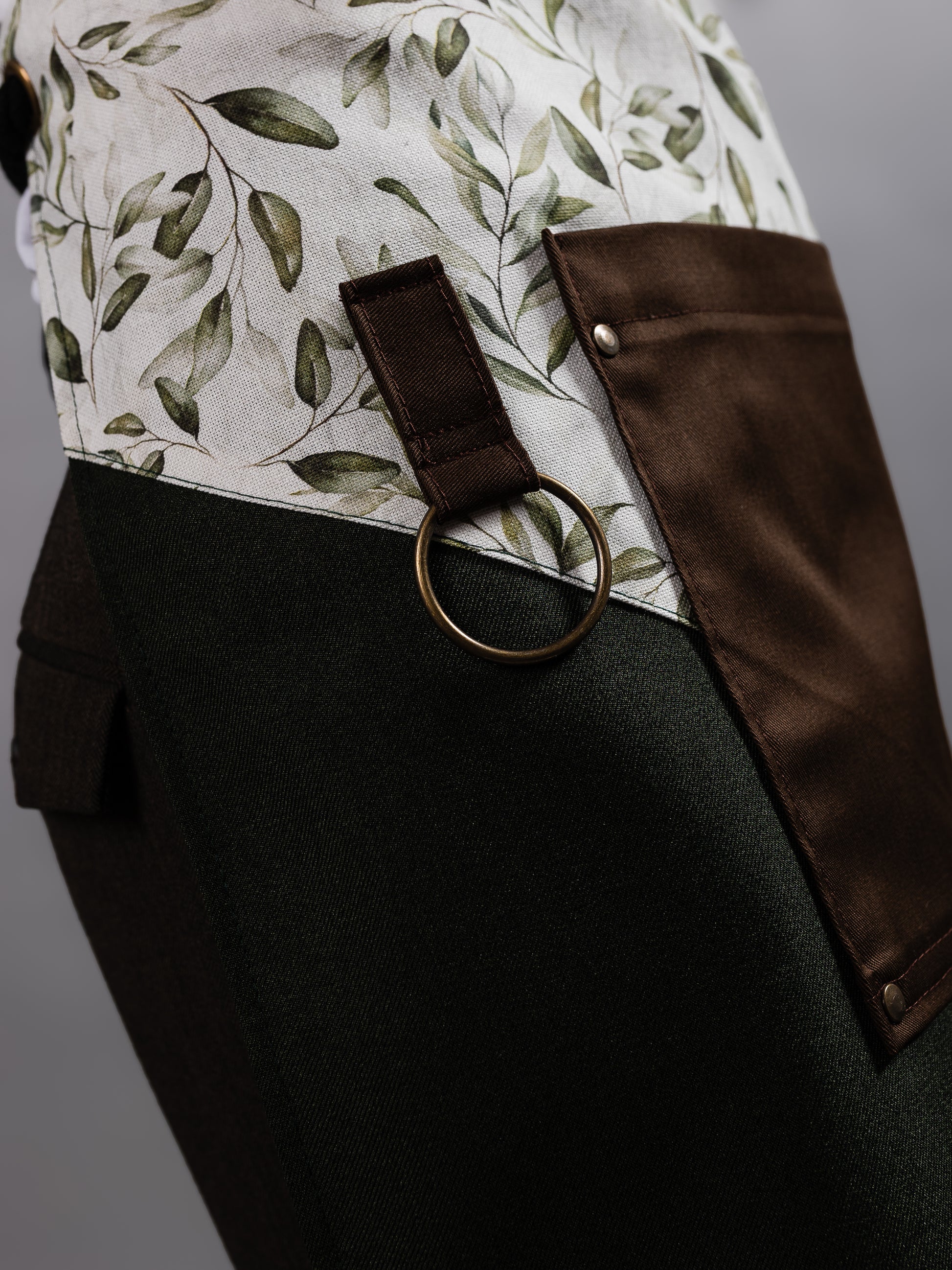 Confecționat din stofă verde închis cu textură fină și completat de un imprimeu botanic delicat, acest model combină funcționalitatea cu eleganța inspirată din peisaje rustice. Bretelele textile, buzunarele generoase și inelul metalic de prindere asigură versatilitate și confort în orice ritm de lucru.