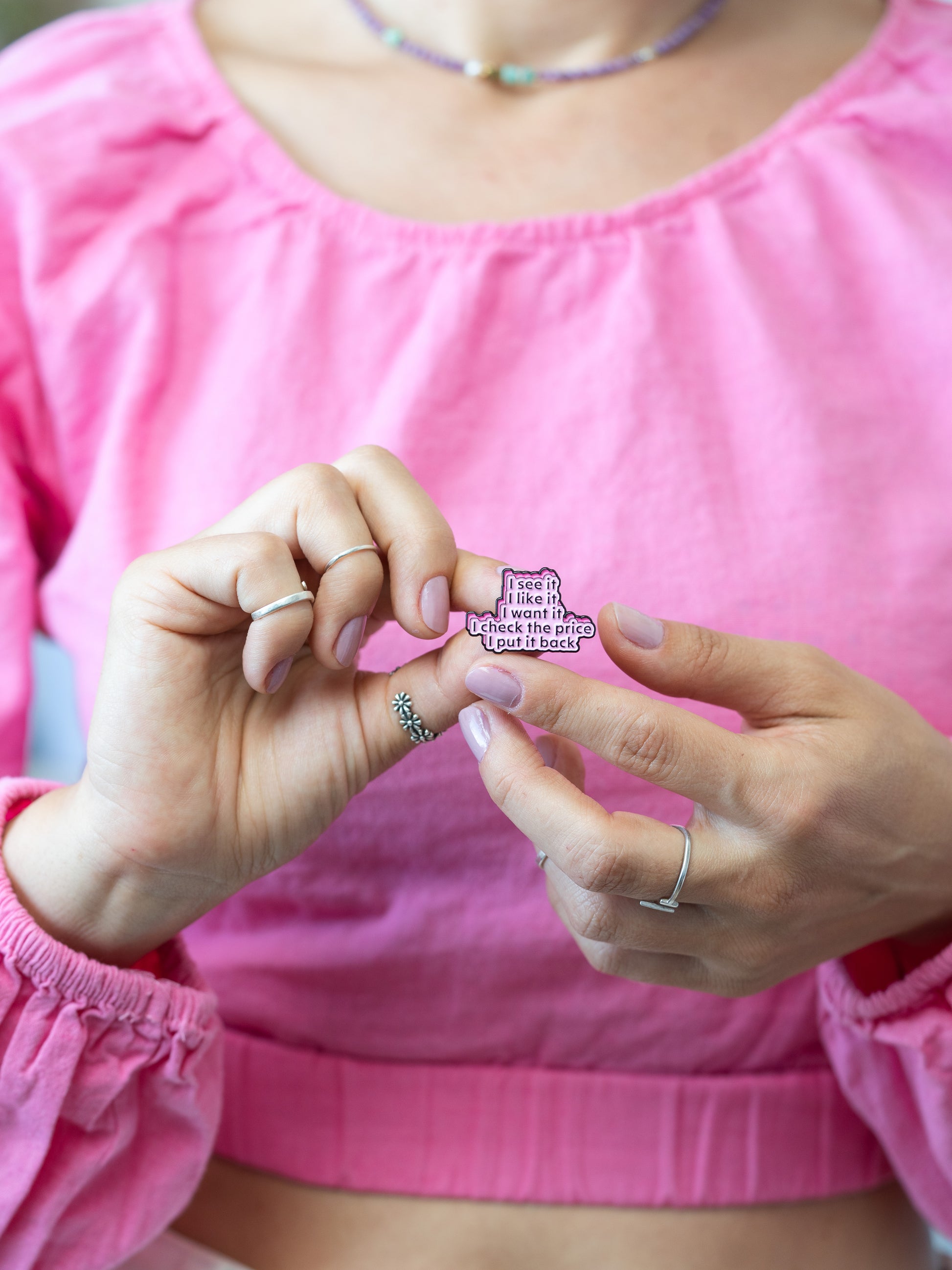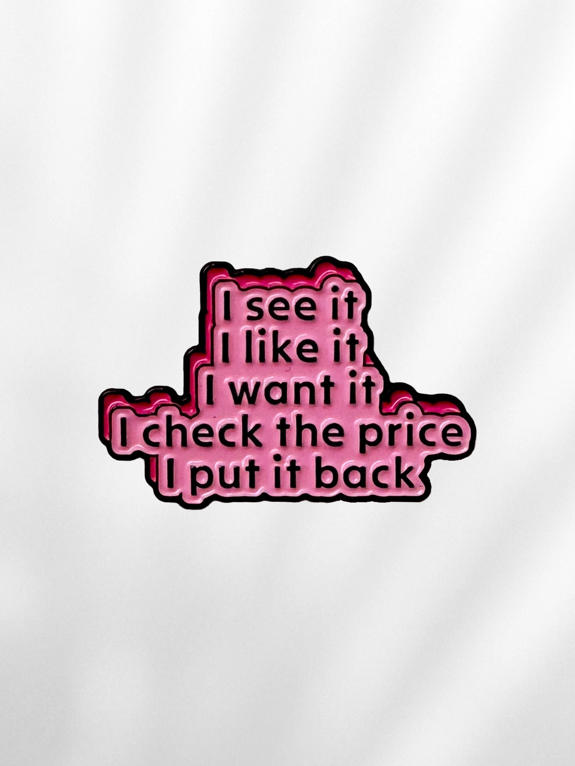 Dedicat celor care visează la shopping extravagant, dar portofelul are alte planuri! Acest pin amuzant surprinde perfect momentul în care găsești ceva perfect, te îndrăgostești de el, dar... prețul îți dă reset.