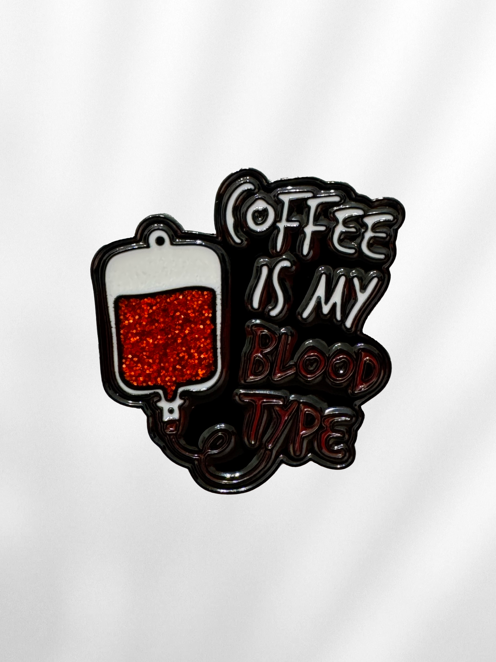 Pin „Coffee is My Blood Type” – Infuzie directă de cofeină!