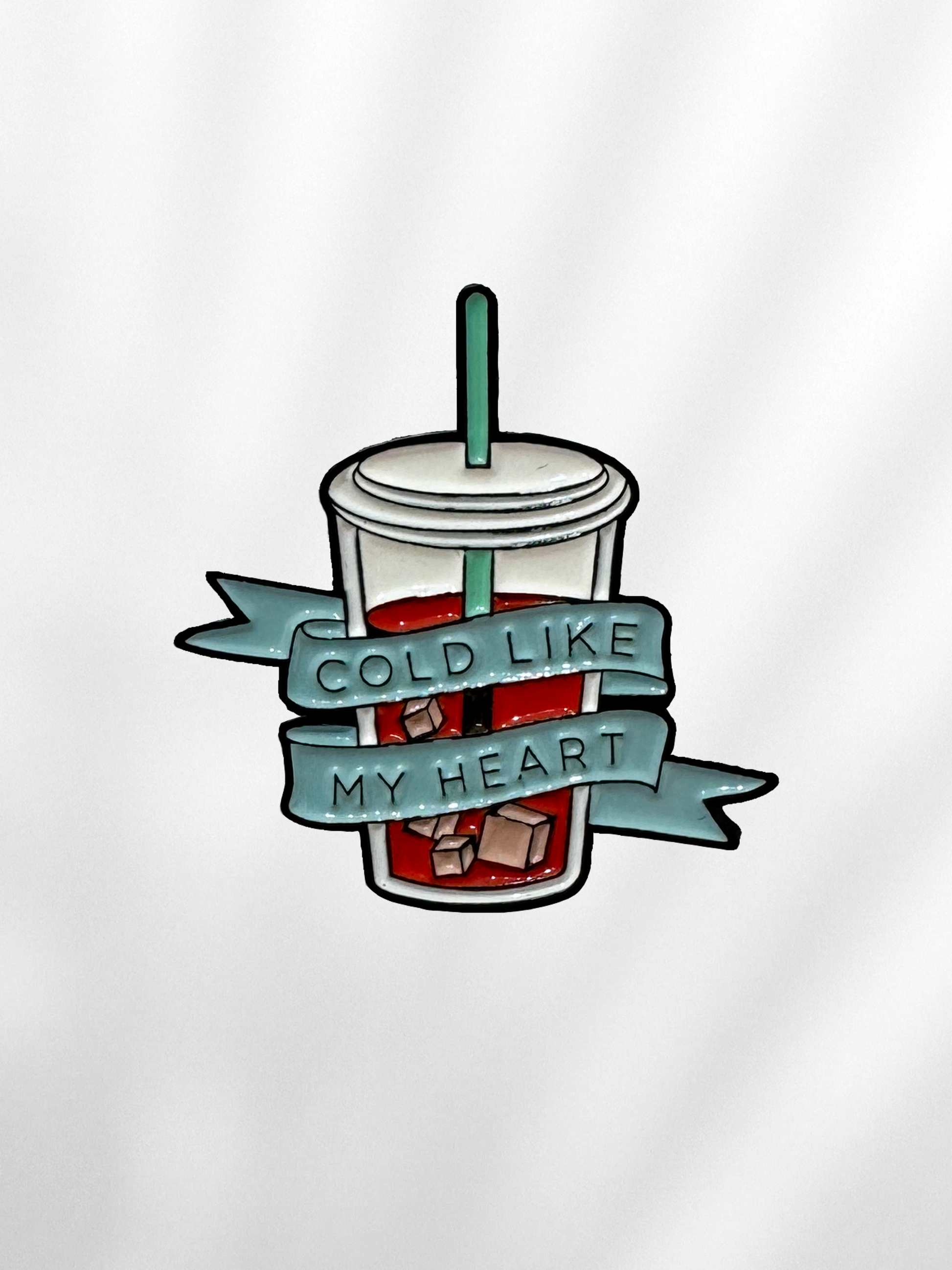 Dedicat celor care iubesc cafeaua rece și au inima de oțel! Acest pin combină estetica clasică a tatuajelor cu un mesaj plin de atitudine, perfect pentru cei care știu că nimic nu bate un iced coffee bine făcut.