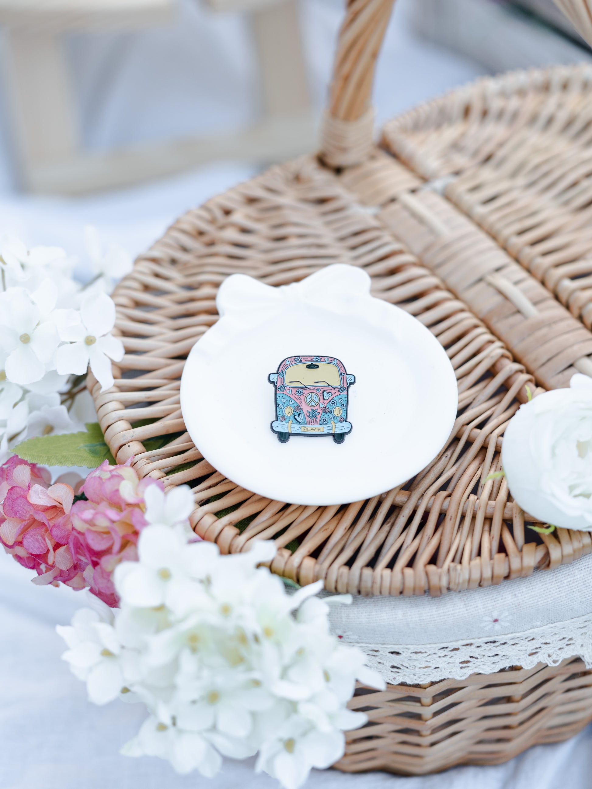 Un microbuz hippie plin de culori, flori și simboluri ale păcii, transformat într-un pin vibrant. Inspirat din spiritul anilor ’70, acest accesoriu aduce good vibes și libertatea drumurilor fără destinație fixă.