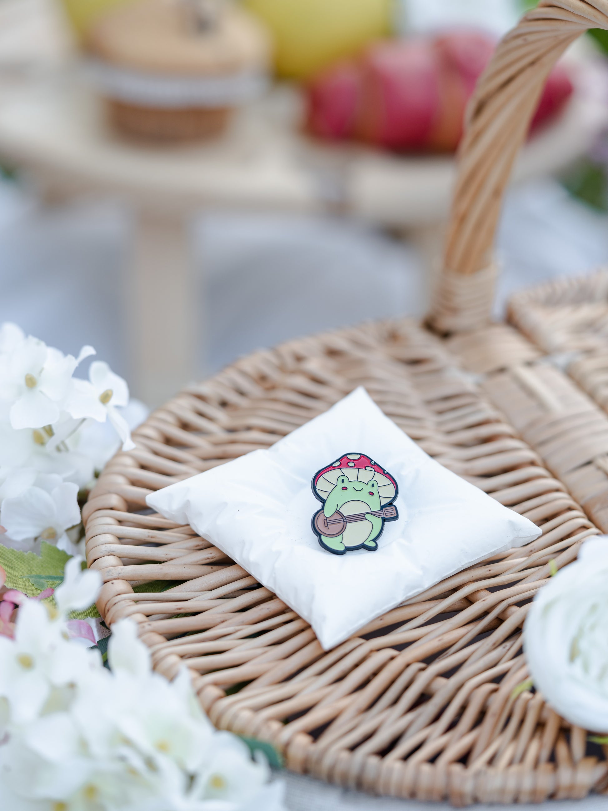 Un broscoi vesel cu pălărie de ciupercă roșie cu buline și un banjo pregătit de concert. Perfect pentru iubitorii de natură, de muzică și de accesorii cu umor și good vibes.