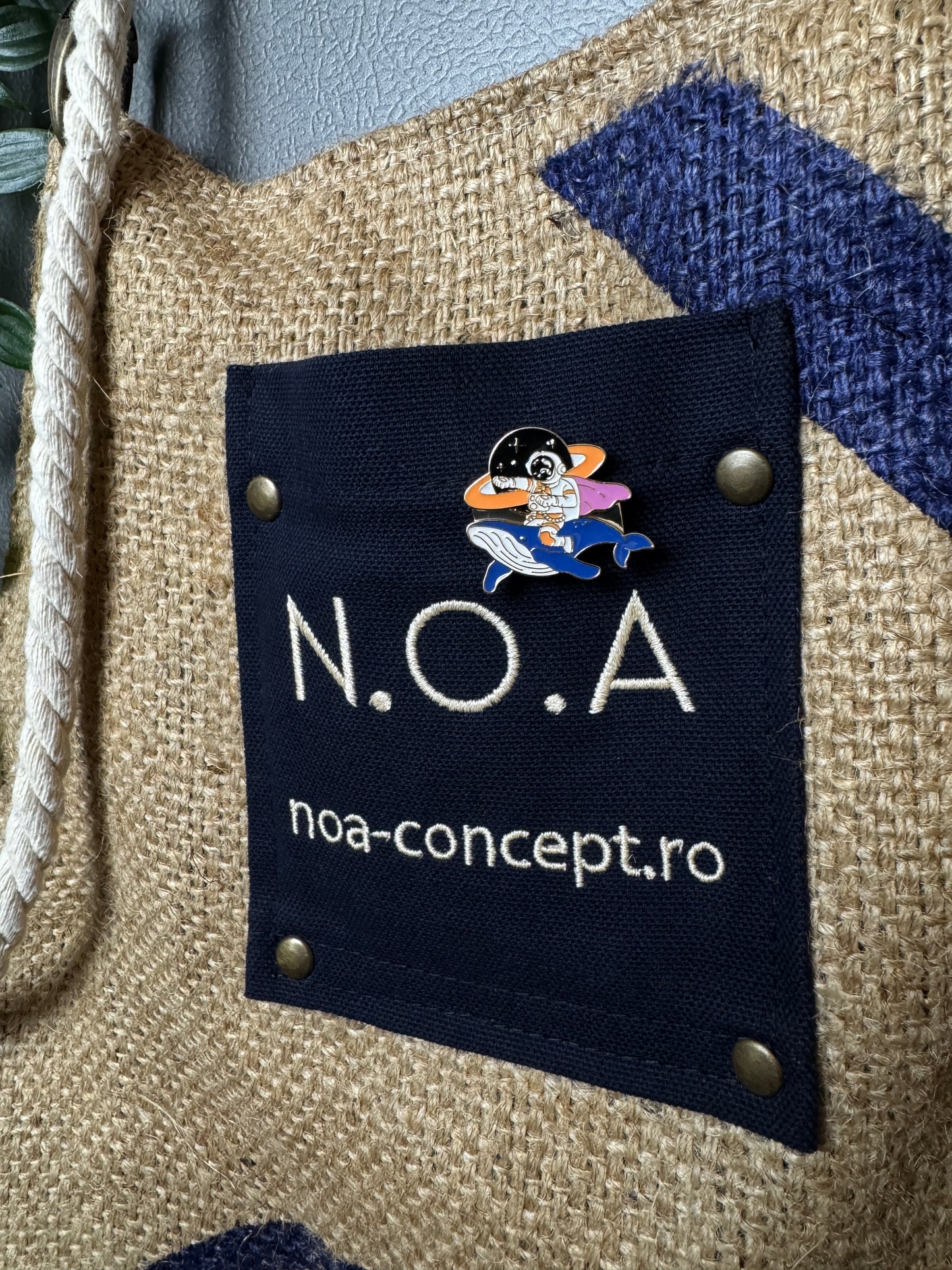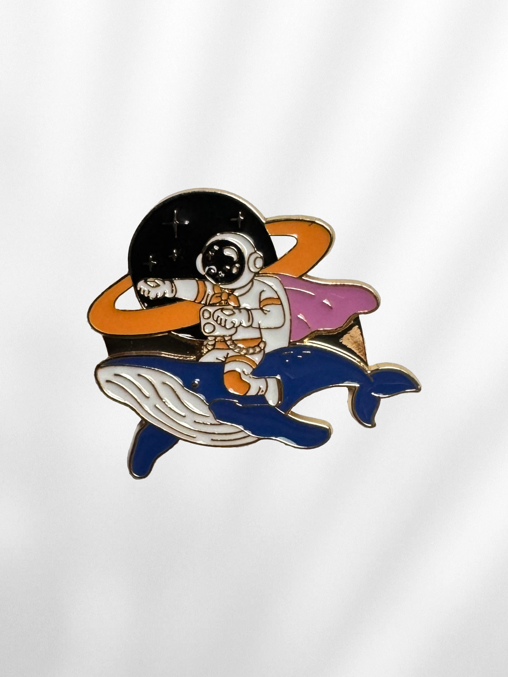 Pin „Orbit Rodeo” – călărește visul, chiar dacă-i o balenă spațială.