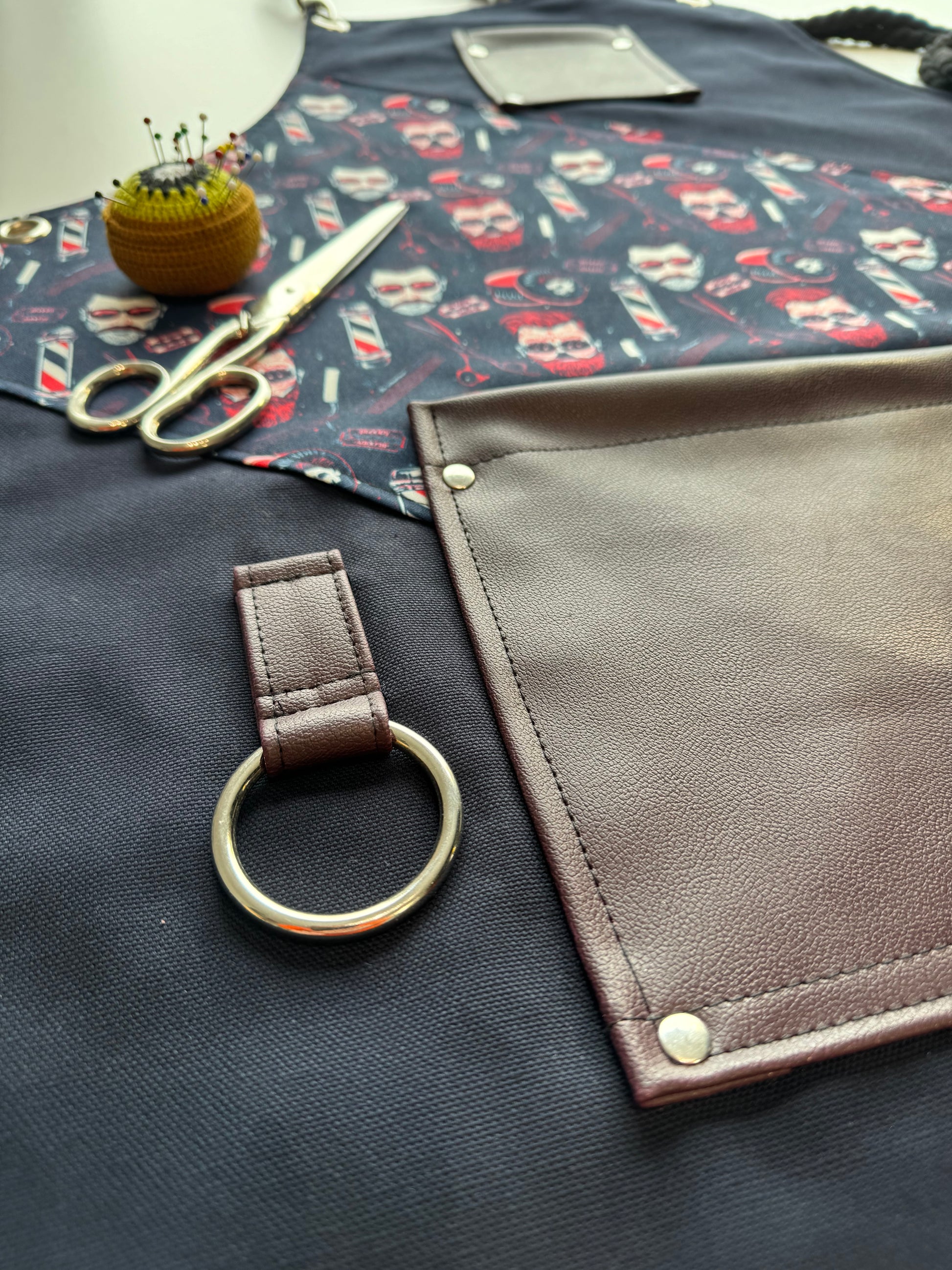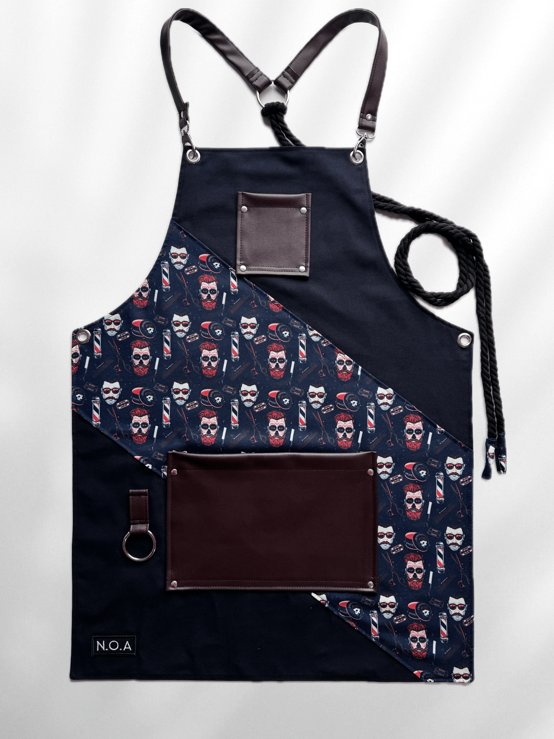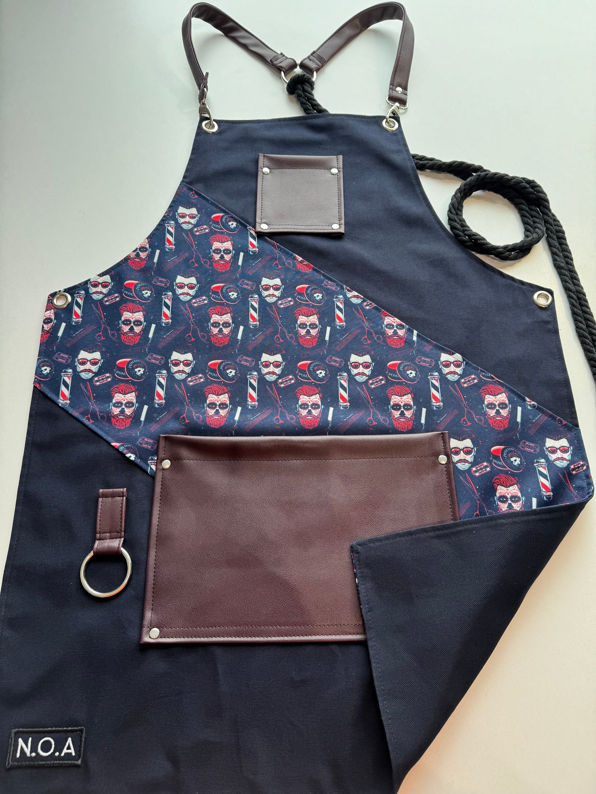 Desigul sortului Navy Trim imbina eleganta si utilitatea intr-un mod rafinat. Cu o baza albastru navy distincta, acest sort premium este perfect pentru cei care doresc sa aduca un aer sofisticat in mediul lor de lucru. Imprimeul cu motive de frizerie adauga un farmec traditional si autentic, subliniind pasiunea pentru mestesugul frizeriei. Buzunarele din piele maro completeaza aspectul, oferind un contrast placut si functionalitate sporita pentru depozitarea instrumentelor esentiale. Experimenteaza confortul si stilul imbunatatit al sortului Navy Trim, ideal pentru profesionistii care apreciaza calitatea si estetica impecabila.